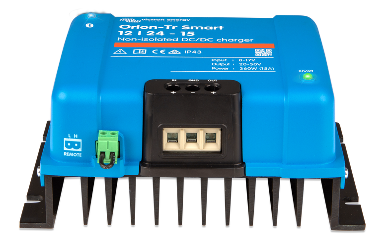 Victron Orion-Tr Smart 12/24-15A (360W) Non-isolated DC-DC charger, 5 Year Warranty. The Orion-Tr Smart DC-DC charger is a professional DC to DC adaptive 3-stage charger with built-in Bluetooth. For use in dual battery systems in vehicles or on boats where the alternator and the start battery are used to charge the service battery. The unit can be monitored and programmed via Bluetooth and can be remotely controlled via a remote on/off switch.
