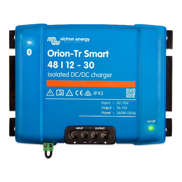 Victron Orion-Tr Smart 48/12-30A (360W) Isolated DC-DC Charger, 5 Year Warranty. The Orion-Tr Smart DC-DC charger is an adaptive 3-stage charger (bulk – absorption – float) designed for dual battery systems, such as in vehicles or on boats where the starter battery (hence the alternator) is used to charge the service battery. The name "Smart" comes from its built-in Bluetooth connection, where the charger can be monitored and configured via Bluetooth and can be remotely controlled via a remote on/off switch and has an engine running detection mechanism. This isolated model allows the input and output to have separate chassis grounds.