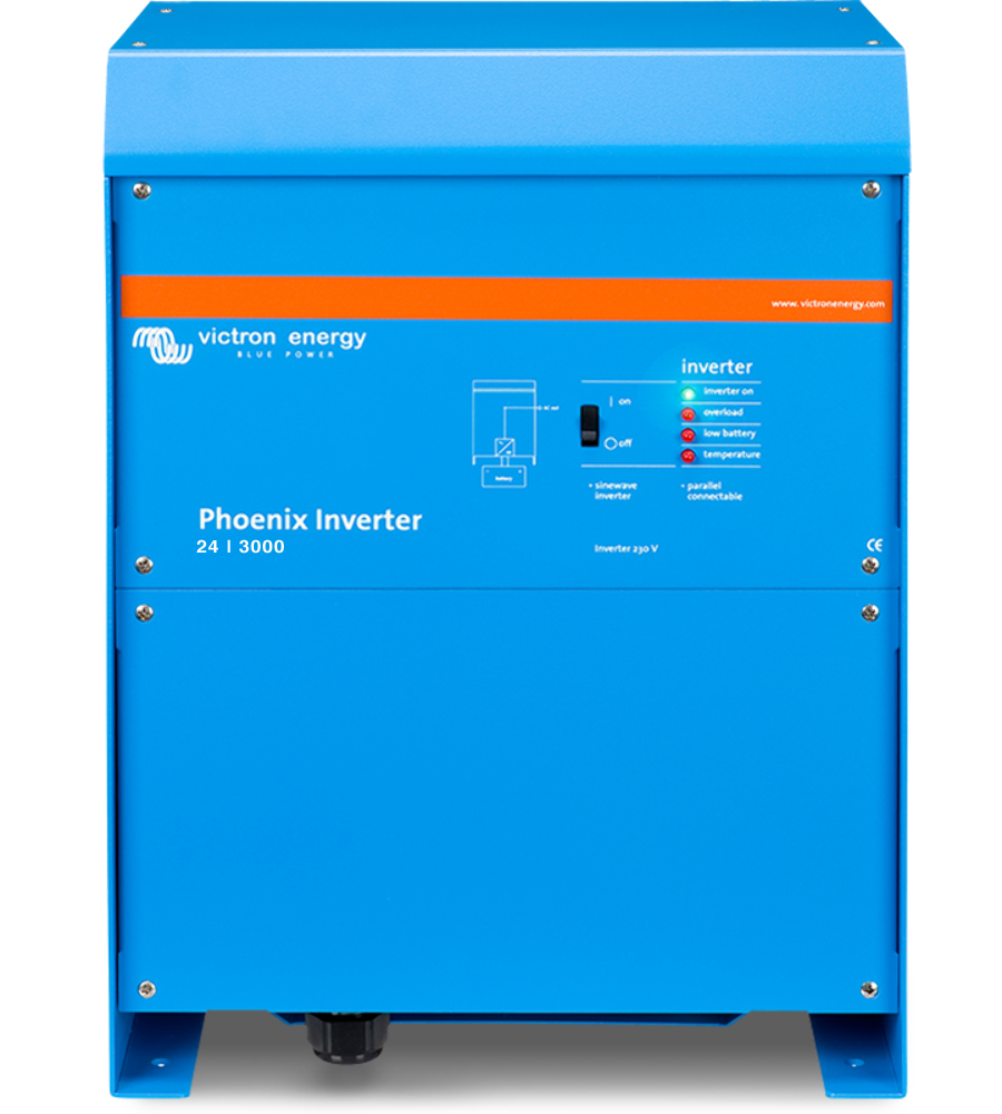 Victron Phoenix Inverter 24V / 3000VA, 5 Year Warranty. Pure sine wave output, high peak power and high efficiency. Combined high frequency and line frequency technologies ensure the best of both worlds.