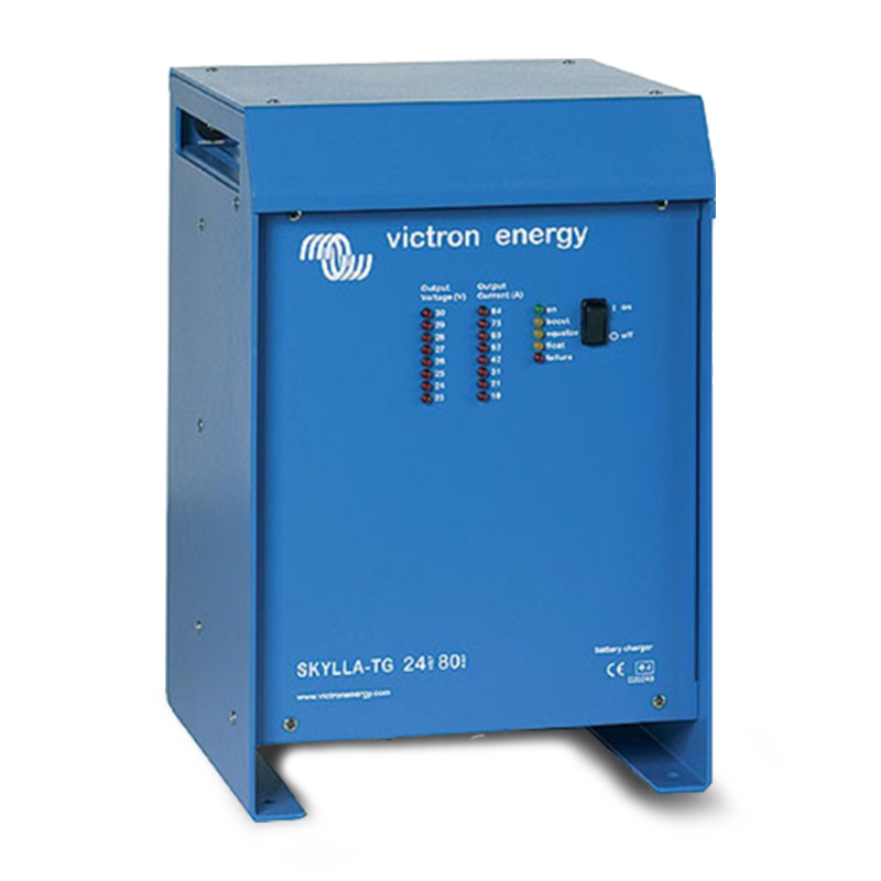 Victron Skylla-TG 24/80 (1+1) Charger, 5 Year Warranty. One full rated output and one 4 Amp output. Charge voltage can be precisely adjusted to suit any battery system. The input for the charger is 230V at 50/60HZ. Charge voltage can be measured directly on the battery terminals in order to compensate for voltage loss due to cable resistance. An external sensor allows measuring battery temperature and compensating charge voltage accordingly.