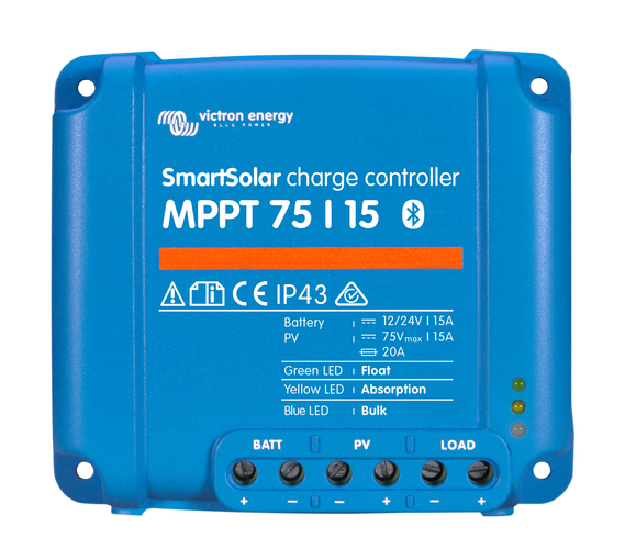 Victron SmartSolar MPPT 75 VOC / 15A Charge Controller, 5 year warranty. A solar charger gathers energy from your solar panels, and stores it in your batteries. Using the latest, fastest technology, SmartSolar maximises this energy-harvest, driving it intelligently to achieve full charge in the shortest possible time. SmartSolar maintains battery health, extending its life.