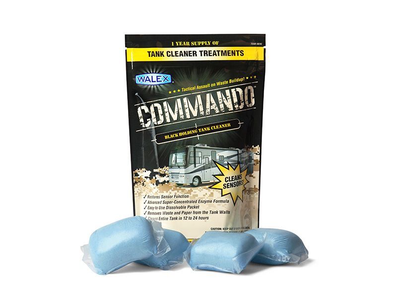 Walex Commando Drop-Ins, 4 Sachets, Tank Cleaner, 1 Year Warranty. Treats your black holding tank system with an all natural enzyme cleaning treatment in as little as 12 hours. Super-concentrated, scientifically developed formula with natural enzymes to penetrate and breakdown waste and paper build up. Use to remove existing buil up or prevent build up accumulation removes residual wate build up that can cause inaccurate sensor readings and residual odours.
