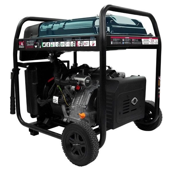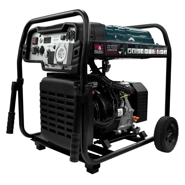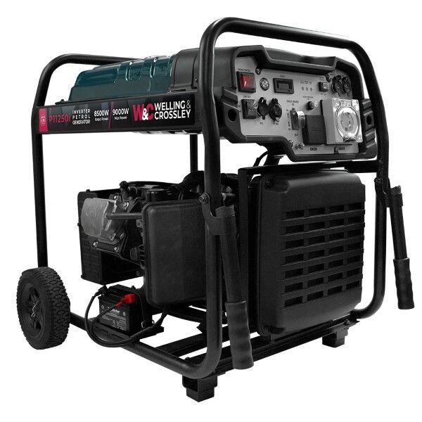 Welling & Crossley 11.25 kVA Open Frame Inverter Petrol Generator with Electric + 2 Wire Start, 2 Years Warranty. The Welling and Crossley P11250i is a powerful 8500W inverter type petrol generator equipped with a convenient electric start. Designed for efficiency and ease of use, this generator comes with a transport kit, including handles and wheels, for easy mobility. The WC-P11250i has a large 25L fuel tank and is compliant with Euro 5 emissions standards, Inverter generators reduce throttle under light loads to limit noise output and further save fuel providing reliable, clean, and consistent power for running multiple appliances over extended periods.