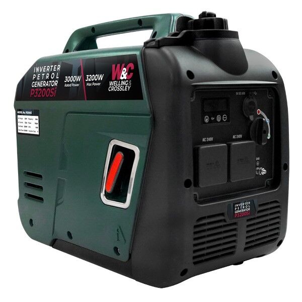 Welling & Crossley 3200W Smart Silent Inverter Petrol Generator, 2 Years Warranty. The Welling and Crossley P3200Si is a Smart Silent Inverter type generator - the ideal companion for camping or outdoor adventures, home essential backup or general home handyman tasks. The highly efficient Euro 5 certified motors and advanced inverter technology provides stable, clean power for sensitive electronics. The intelligent idle control optimises fuel efficiency and reduces noise. Grab the built in carry handle enjoy the convenience of a full-colour LCD display and quick-charge USB ports.