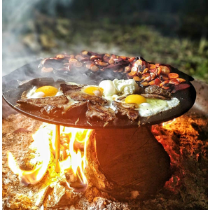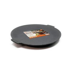 Wildtrak 45cm Round Cast Iron BBQ Plate with Removeable Legs, 1 Year Warranty. This pre seasoned cast iron camp grill has removable legs so it can be stored away neatly when not in use.