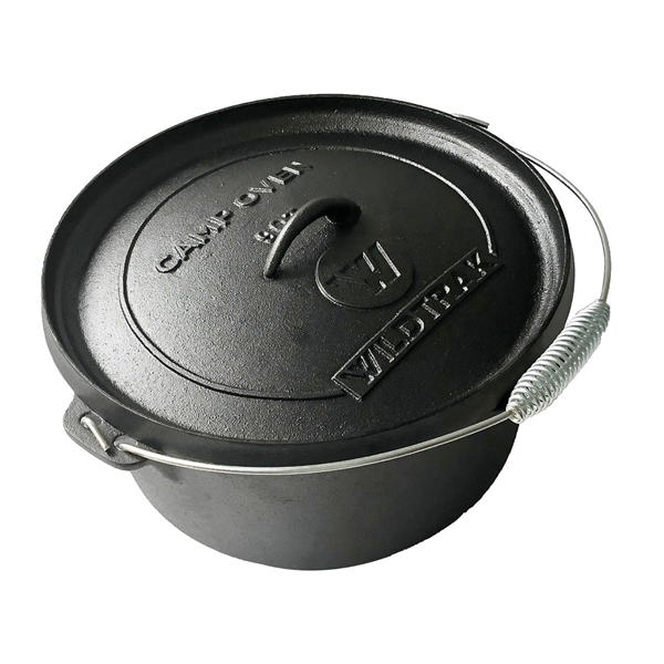 Wildtrak 9Qt Cast Iron Camp Oven, 1 Year Warranty. Pre seasoned and heavy duty, our 9 quart cast iron camp oven is a great way to cook around the campsite, from bread to soups, roasts to cakes.