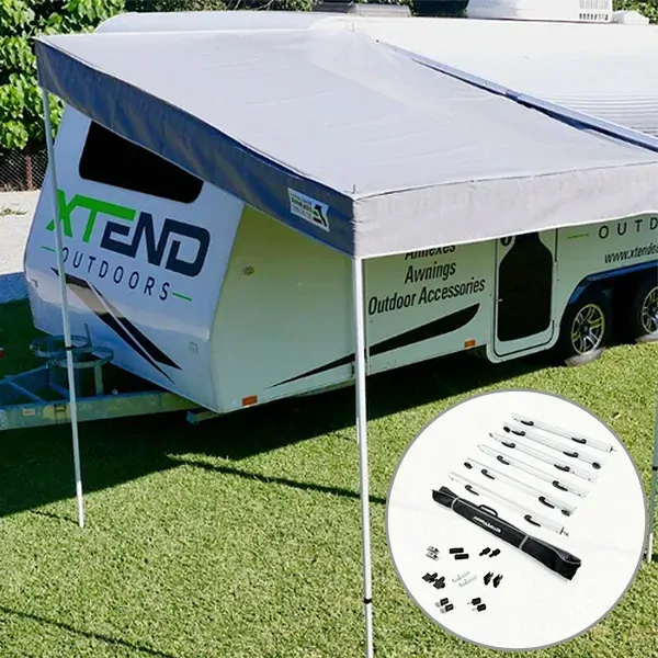 Xtend Small BBQ Porch with White Anti-Flap Kit (AFK) Pro+ Bundle, 1 Year Warranty. The Xtend BBQ Porch and Aussie Traveller Anti Flap bundle is the ultimate solution to increasing your outdoor leisure space to be the envy of the caravan park. The Anti Flap Kit is the number one key accessory to outdoor living spaces, it adds strength and stability and fits perfectly with the Xtend BBQ Porch. The porch provides the perfect protection to your slide out BBQ in tunnel boots or to give you extended shade for your large family.