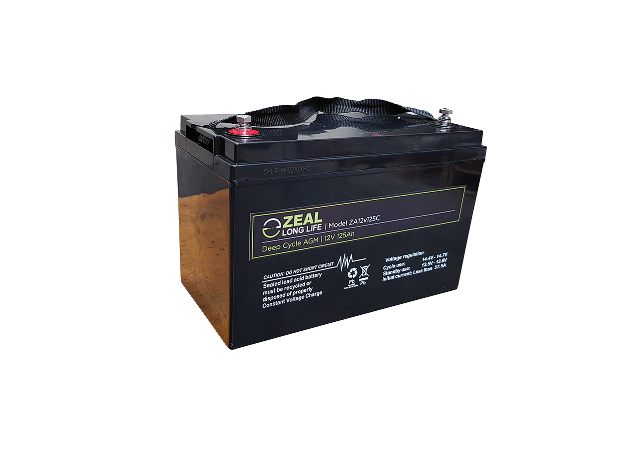 Zeal 125Ah 12V AGM Deep Cycle Battery, 1 Year Warranty. The Zeal AGM range is a quality range ideally suited for a wide range of general purpose and cost critical applications. The Zeal AGM range has very low internal resistance, is capable to deliver high currents on demand and offers a relatively long service life, even when deep cycled. The Zeal AGM range is maintenance and spill free, provides strong reliability with a low self-discharge.