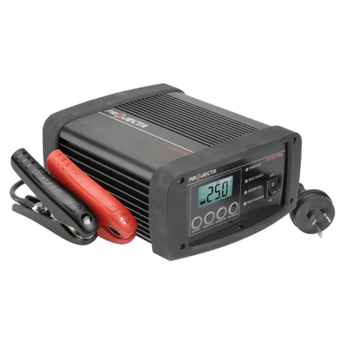 Projecta 12V Automatic 25A 7 Stage Workshop Battery Charger, 1 Year Warranty. Ideal for workshop environments, this powerful charger features protective rubber moulded end caps for superior durability. It offers all the features of its standard 25A counterpart without the remote control and temperature compensation probe.