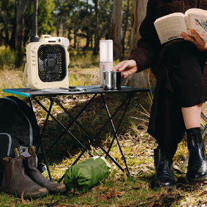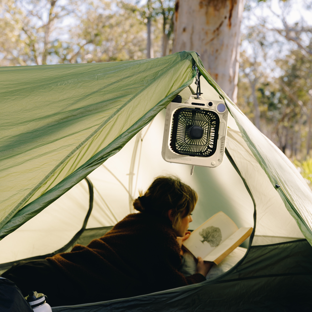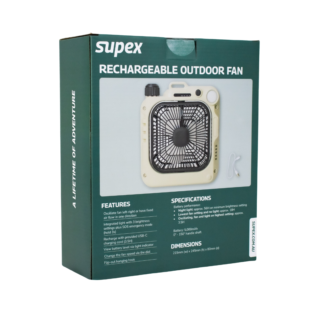 Supex 12V Outdoor Camping Fan, 1 Year Warranty. Blow the summer heat away with this handy fan, ideal for tents, caravans & camper trailer setups. With optional angles, fan speeds, lights and oscillation, this fan provides home-away-from-home comfort whilst on an adventure.