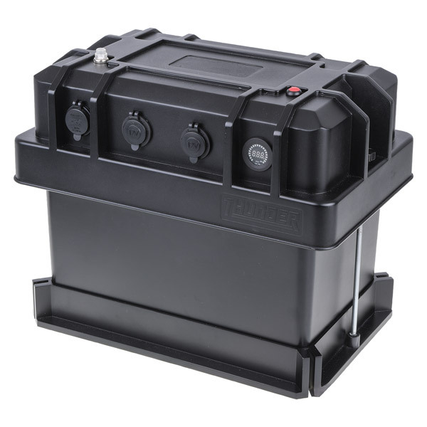 Thunder 12V Heavy Duty Battery Box, 1 year warranty. Caravan, camping and 4WD enthusiasts are in need of a portable battery box that will withstand all weekend adventures. The Thunder Heavy Duty Battery Box is designed with the 12V caravan, camping and 4WD market in mind. It is big enough to take a 120Ah AGM deep cycle battery and has internal battery strap mounts to keep the battery secure.